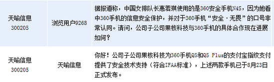 天喻信息回應,公司子公司果核科技為360手機Q5和Q5 Plus的支付寶指紋支付提供了安全技術(shù)支持(符合IFAA標準),上述兩款手機已于8月23日正式發(fā)布。