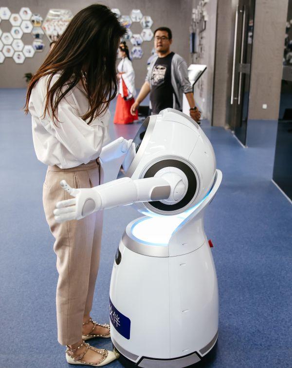 資料圖片:“云朵”智能互動機器人在擁抱一位觀眾。它能與人對話交流,還能表演唱歌跳舞。新華社記者張鋮攝