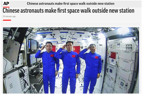 美聯(lián)社:中國宇航天員首次在新空間站外進行太空行走
