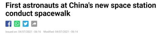 “中國航天員進入太空,以開展艙外工作?!倍硭股鐒t以此為題報道稱,中國航天員劉伯明、湯洪波當日從天和核心艙節(jié)點艙成功出艙,在艙內(nèi)的航天員聶海勝配合支持兩名出艙航天員開展艙外操作。報道稱,這是中國航天員近13年來首次開展艙外活動。