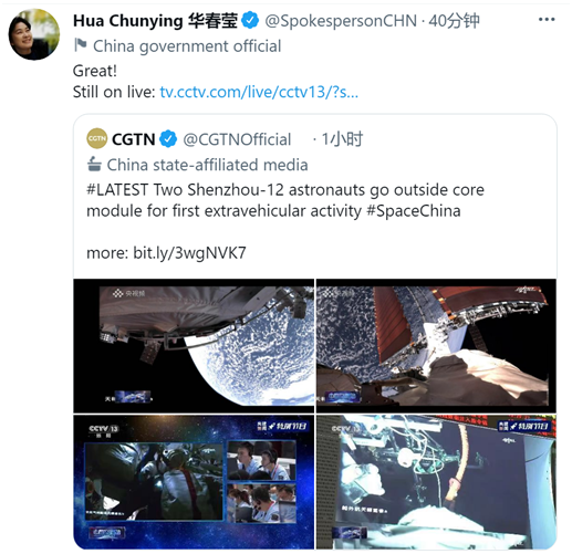 航天員出艙后,中國外交部發(fā)言人華春瑩轉(zhuǎn)發(fā)報道并感嘆:“太棒了!”↓
