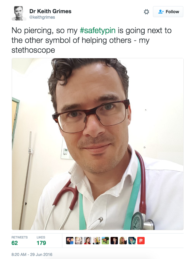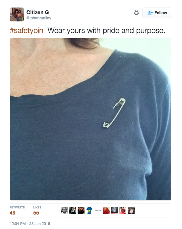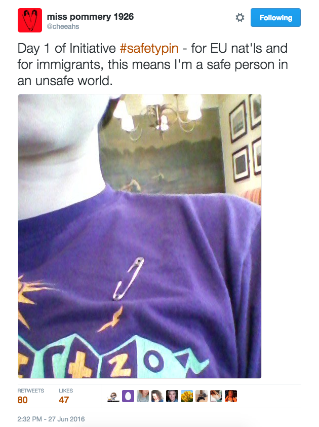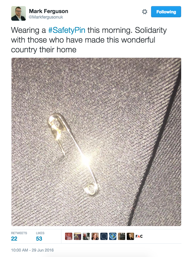 英國“脫歐”公投結(jié)果出來以后,英國境內(nèi)出現(xiàn)了一系列的種族主義事件。倫敦哈默史密斯的波蘭中心的墻上畫滿了種族主義的涂鴉。來自美國的艾莉森對此十分傷感,接受采訪時她說:“我不是英國公民,我沒法投票,我也不可以發(fā)起政治運動,但我總想做點事情?!庇谑撬诰W(wǎng)上發(fā)起了“安全別針”的活動,稱只要帶上別針即代表“我是安全的,你可以坐在我旁邊,你可以和我交流,你也可以向我求助?!?/p>