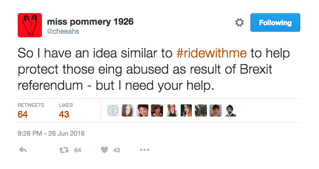 艾莉森在社交媒體發(fā)文:我有一個主意和ridewithme很像,用來保護那些因為脫歐公投而受歧視的人,但我需要你們的幫助