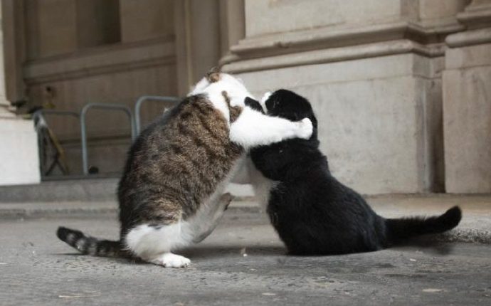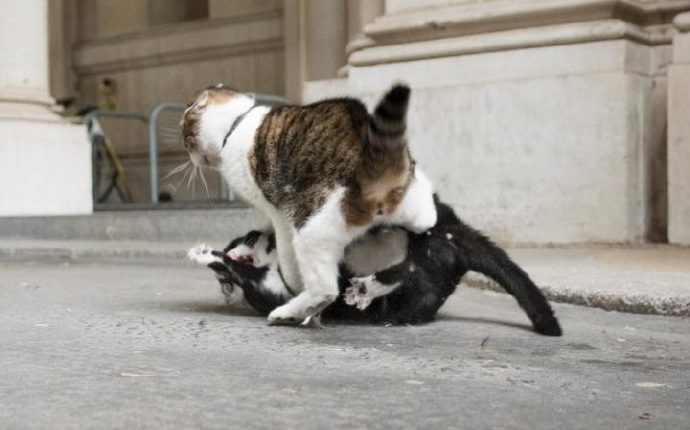 7月17日,“外交部首席捕鼠貓”Palmerston偷偷溜進唐寧街10號,并在內(nèi)務(wù)府門口和Larry爆發(fā)了一場戰(zhàn)爭。從畫面來看,兩貓不相上下,甚至Larry多次占上風(fēng),或?qū)Ψ綋涞?,或?qū)⑵洳仍谀_下。