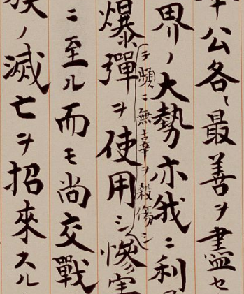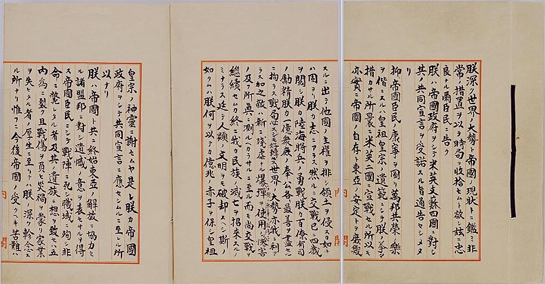 停戰(zhàn)詔書沒有提及戰(zhàn)敗二字,由于在有限的時間內,內容多次推敲,因此形容“戰(zhàn)況沒有好轉的趨勢”、“原爆殺害無辜”部分,有明顯涂改過的痕跡。天皇之印也同詔書文字重疊。