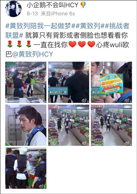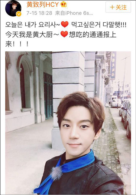 今年7月,黃致列參與錄制《挑戰(zhàn)者聯(lián)盟》,當(dāng)時(shí),他還開心地拍下和隊(duì)友穿相同廚師服的照片,在微博上興奮地說(shuō):“今天我是黃大廚~想吃的通通報(bào)上來(lái)!”