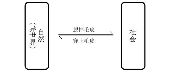 動(dòng)物形態(tài)和人類形態(tài)象征著自然和社會(huì)兩種屬性,姑獲鳥、賽爾琪和梅洛這些女妖是同時(shí)具備了這兩種屬性的生物。其中自然屬性附著于她們的毛皮之上,脫下了這層毛皮,她們就暫時(shí)擺脫了自然屬性,呈現(xiàn)出社會(huì)性,而當(dāng)她重新披上毛皮,社會(huì)屬性就被隱藏到了自然屬性底下。
