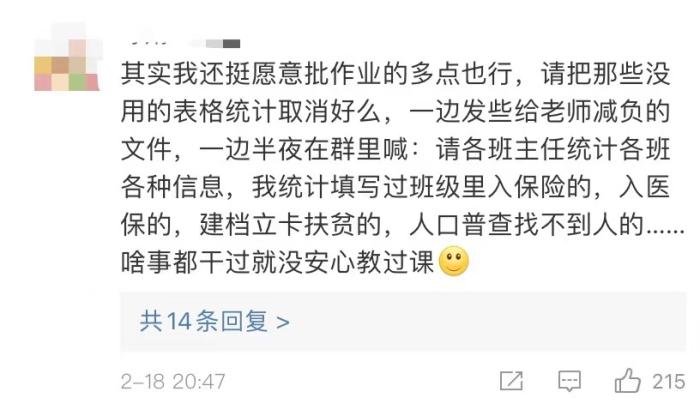 從網(wǎng)友評(píng)論可以看出,一些瑣碎的行政工作令老師們身心俱疲,讓教師回到本職工作,不止是家長(zhǎng)們的呼聲,也是老師們的期盼。