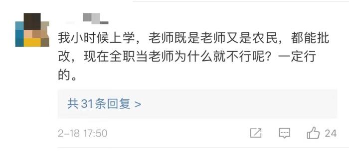“我小時(shí)候上學(xué),老師既是老師又是農(nóng)民,都能批改,現(xiàn)在全職當(dāng)老師為什么就不行呢?”