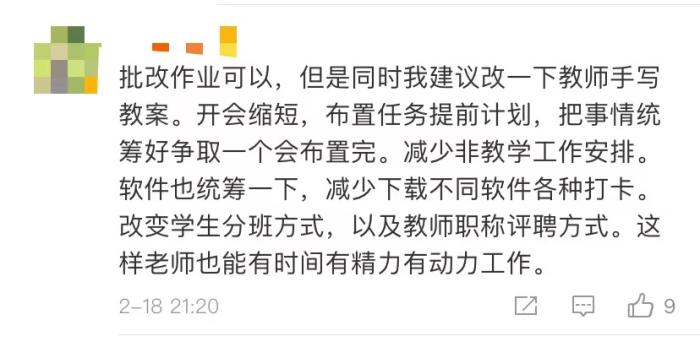 “批改作業(yè)可以,但是同時(shí)我建議一下教師手寫教案,開(kāi)會(huì)縮短,減少非教學(xué)安排……”
