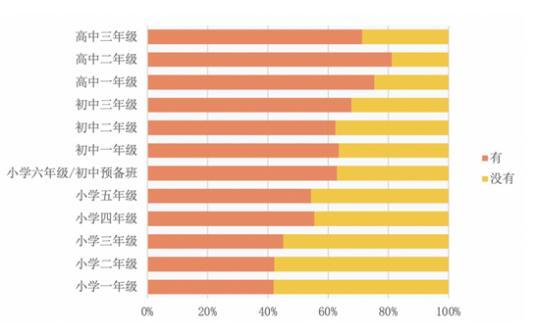 高中生擁有個(gè)人專(zhuān)屬電子移動(dòng)設(shè)備的學(xué)生比例為77.4%,這一比例在初中生中是64.6%,而小學(xué)階段為50.7%。此外,年級(jí)之間也存在差異。課題組調(diào)查數(shù)據(jù)顯示,年級(jí)越高(除高三外),擁有移動(dòng)電子產(chǎn)品的學(xué)生比例越高。即使是小學(xué)一年級(jí)學(xué)生,也有超過(guò)40%學(xué)生擁有自己的移動(dòng)電子產(chǎn)品。