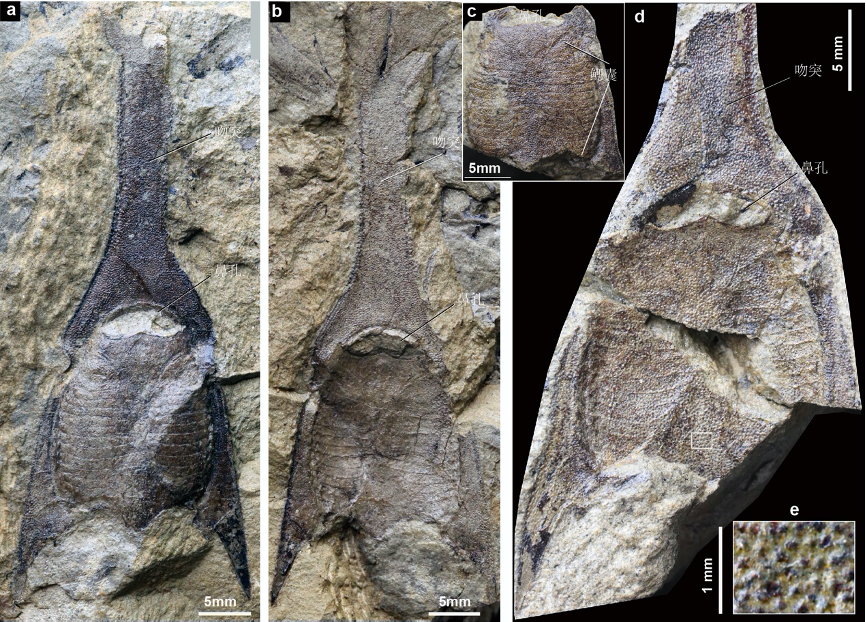 論文第一作者、中科院古脊椎所副研究員蓋志琨介紹,長吻三歧魚是一種約10厘米長的小魚,前面吻突最長可達5厘米。這種魚在分類上屬于無頜類盔甲魚亞綱三歧魚科,其頭甲形狀形似古代兵器三叉戟。目前三歧魚科僅有1屬3個種,分別是長吻三歧魚、昭通三歧魚和越南三歧魚,堪稱三歧魚三兄弟。
