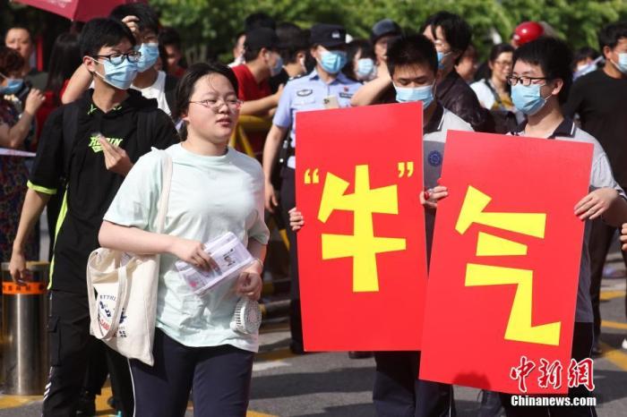 6月7日,江蘇省南京市雨花臺中學(xué)高考考點前,高二的學(xué)生手舉“牛氣沖天”“牛轉(zhuǎn)乾坤”字樣為考生加油鼓勁。 中新社記者 泱波 攝
