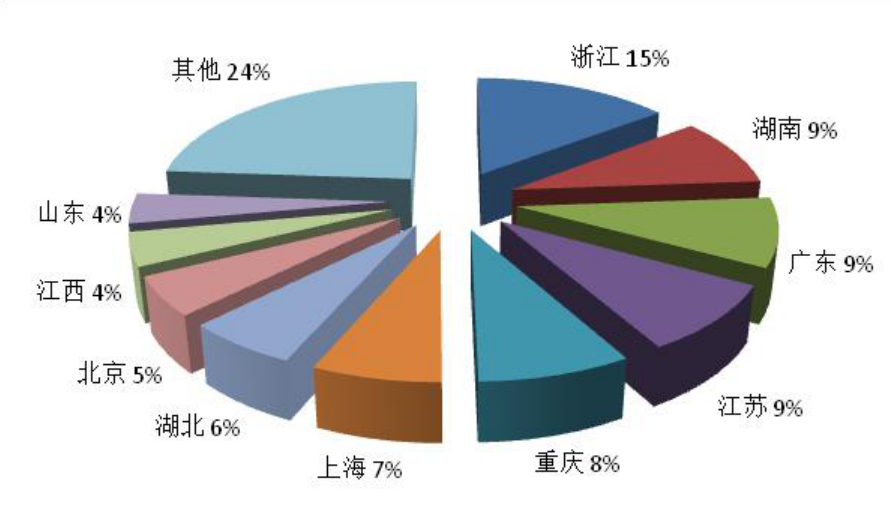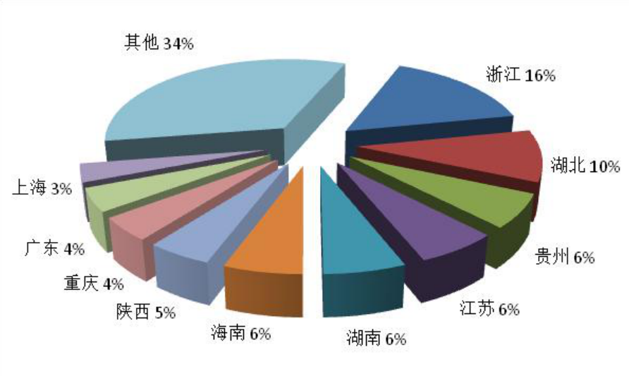 第三季度旅行社國內(nèi)旅游接待人次排名前十位的地區(qū)由高到低依次為浙江、湖北、貴州、江蘇、湖南、海南、陜西、重慶、廣東、上海(見圖2)。?