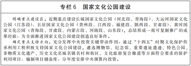 推進(jìn)國家文化公園建設(shè),生動呈現(xiàn)中華文化的獨(dú)特創(chuàng)造、價(jià)值理念和鮮明特色,樹立和突出各民族共享的中華文化符號和中華民族形象,探索新時(shí)代文物和文化資源保護(hù)傳承利用新路徑,把國家文化公園建設(shè)成為傳承中華文明的歷史文化走廊、中華民族共同精神家園、提升人民生活品質(zhì)的文化和旅游體驗(yàn)空間。加快建設(shè)長城、大運(yùn)河、長征、黃河等國家文化公園,整合具有突出意義、重要影響、重大主題的文物和文化資源,重點(diǎn)建設(shè)管控保護(hù)、主題展示、文旅融合、傳統(tǒng)利用四類主體功能區(qū),實(shí)施保護(hù)傳承、研究發(fā)掘、環(huán)境配套、文旅融合、數(shù)字再現(xiàn)五大工程,突出“萬里長城”、“千年運(yùn)河”、“兩萬五千里長征”、“九曲黃河”整體辨識度。推進(jìn)優(yōu)質(zhì)文化旅游資源一體化開發(fā),科學(xué)規(guī)劃、開發(fā)文化旅游產(chǎn)品和商品。推出參觀游覽聯(lián)程聯(lián)運(yùn)經(jīng)典線路,開展整體品牌塑造和營銷推介。