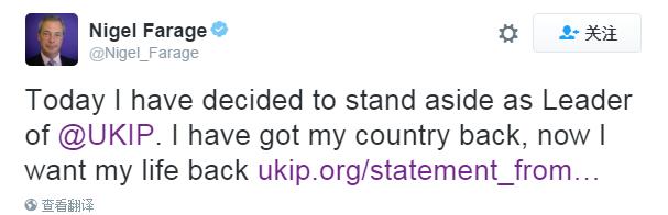 法拉奇在個人推特上表示辭去獨立黨領袖職位,“我已經找回我的國家,現在我要找回我自己的生活”