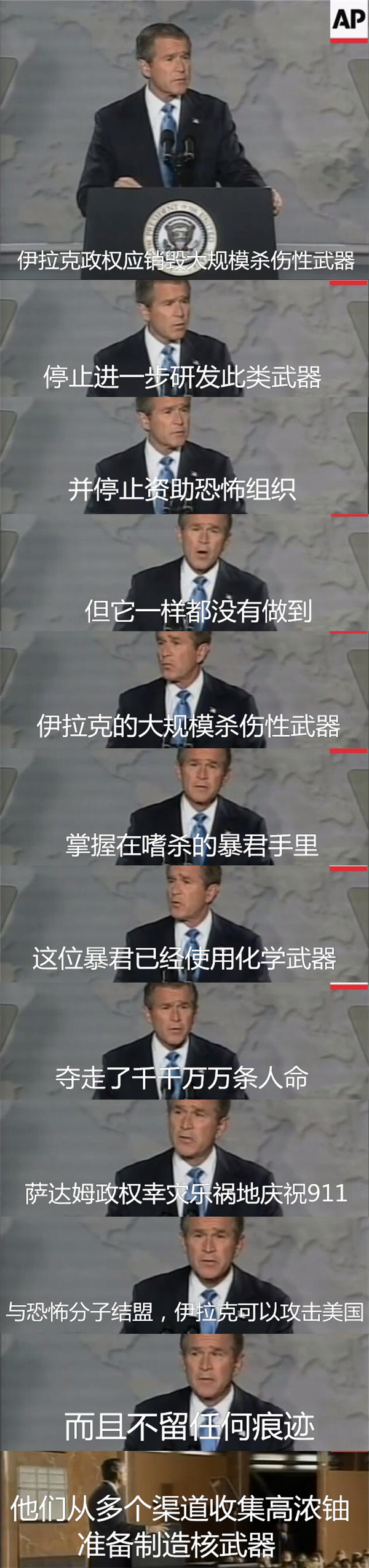在著名的辛辛那提演講里,小布什更是直接宣布,除了大殺器,資助恐怖分子,薩達姆還采購高濃鈾準備制造核武器。