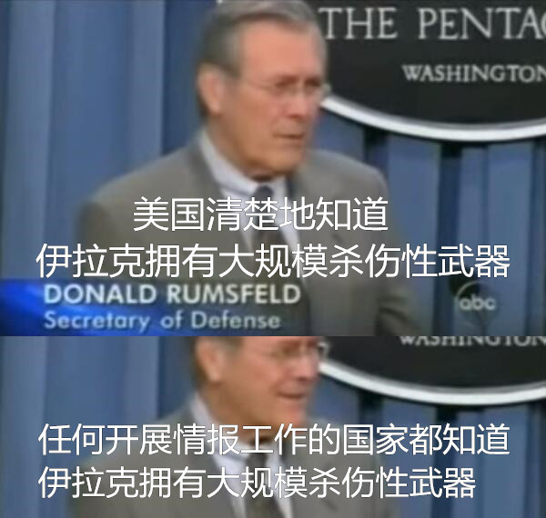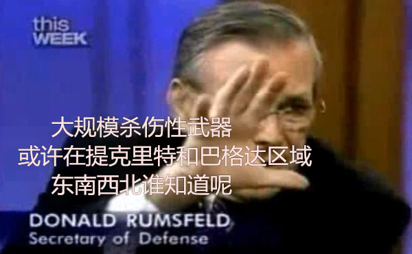 既然總統(tǒng)先生已經(jīng)定下了口徑,當年的美國防長拉姆斯菲爾德也不甘落后:伊拉克有大殺器這事兒板上釘釘?shù)?