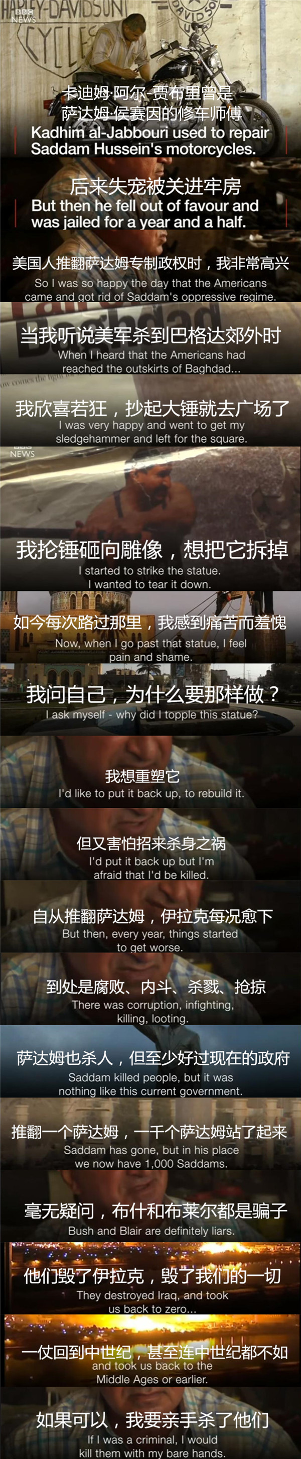 2003年,卡迪姆·阿爾-賈布里曾因揮錘砸薩達姆雕像,登上無數(shù)媒體封面,紅極一時。然而今天,他說:“推翻一個薩達姆,一千個薩達姆站了起來?!?/p>