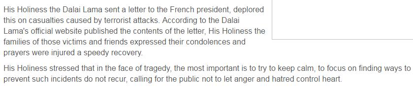 達賴致信奧朗德,表示面對慘劇時,最重要的是努力保持平靜,呼吁法國大眾“不要讓憤怒與仇恨控制內(nèi)心”。
