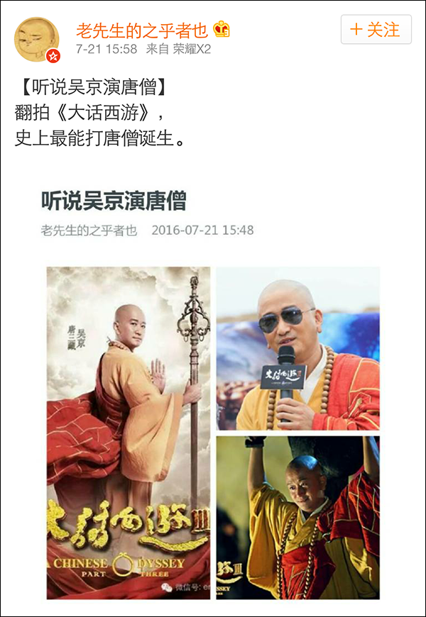 7月21日,新浪博主@老先生的之乎者也,分享了一張長圖:“翻拍《大話西游》,史上最能打唐僧誕生”。