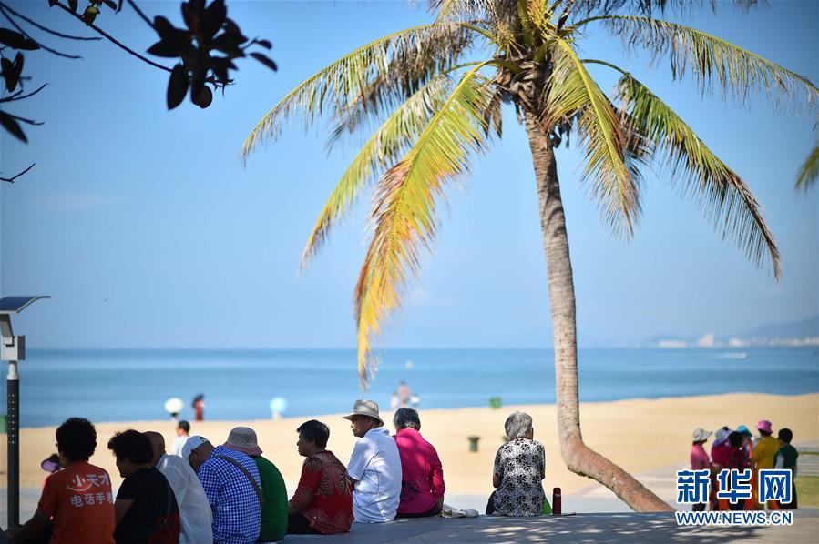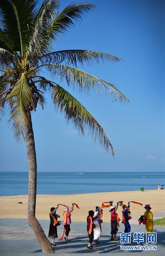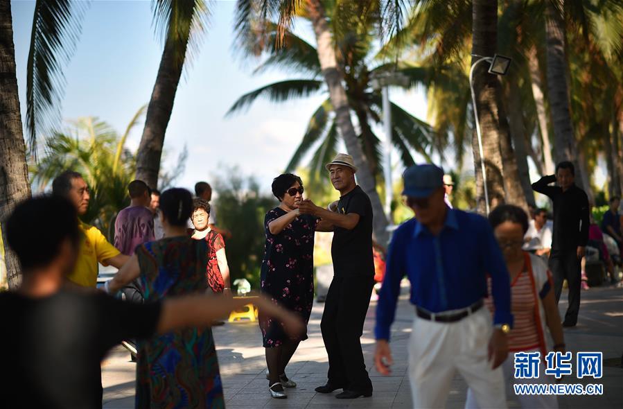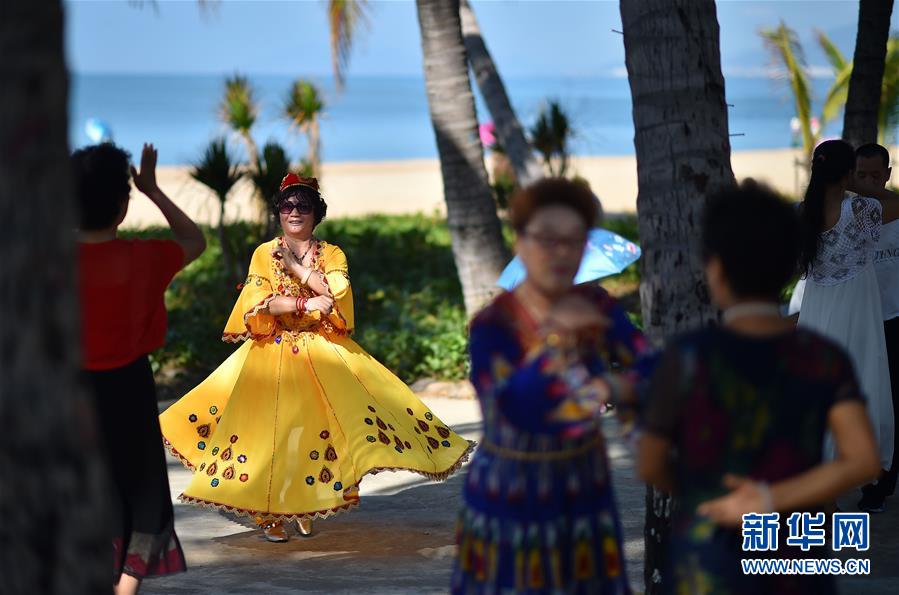 10月28日,老人們在三亞灣跳舞。隨著北方天氣逐漸變冷,眾多老年人開始了一年一度的“南飛”。在海南省三亞市,越來越多的“候鳥老人”來到這里享受陽光、沙灘、椰林。新華社記者 郭程 攝