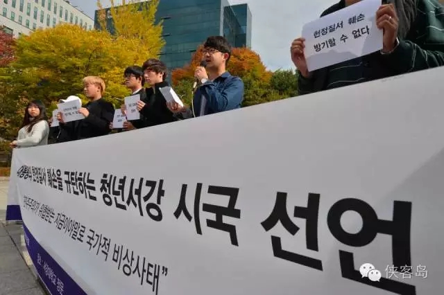截至10月29日,已有四十多所大學(xué)的學(xué)生在學(xué)校貼出大字報,并發(fā)表“時局宣言”,聲討樸槿惠和崔順實。韓國外國語大學(xué)別出心裁地貼出了10種語言的宣傳口號(這是要讓全世界人民都“評評理”啊),秉承儒家理念的成均館大學(xué)的學(xué)生則穿著儒生服打出了“見義不為,無勇也”的木牌。多所大學(xué)的教授團體也陸續(xù)發(fā)表宣言,呼吁樸槿惠下臺、成立中立內(nèi)閣。韓國網(wǎng)上還出現(xiàn)了一份《五十國韓僑敦促樸總統(tǒng)下臺書》,表示“總統(tǒng)成為個人的傀儡,這個事實已經(jīng)滿天下皆知了;這是把國家打入深淵的重大犯罪和國家恥辱”。