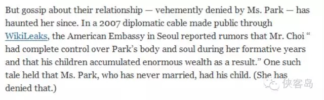 《紐約時報》 10月27日的一篇報道——記者是韓國人,據(jù)說是第二位獲得普利策新聞獎的韓國人——說,1979年槍殺樸正熙的中央情報部部長金載圭在一次法庭陳述時說,他之所以射殺樸正熙,其中一個原因就是樸正熙未能阻止崔太敏的非法牟利活動,未能讓崔太敏遠離自己的女兒。該報道繼續(xù)說“有關(guān)樸槿惠崔太敏關(guān)系的傳聞——樸槿惠曾矢口否認——一直困擾著她。維基解密公開的2007年的一份外交電報顯示,駐韓美國使館曾匯報說,崔太敏先生‘曾在樸槿惠的性格形成期徹底控制了她的身體和心靈,他的孩子們由此積累了巨額財富’。其中一個傳言說,一生未婚的樸槿惠與崔太敏之間育有一子(她否認了此點)”。