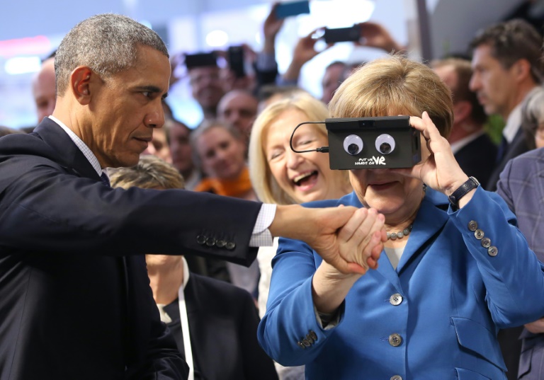 2016年4月,奧巴馬訪德大贊默克爾,對(duì)待難民危機(jī)的態(tài)度令?yuàn)W巴馬敬佩不已。AFP圖