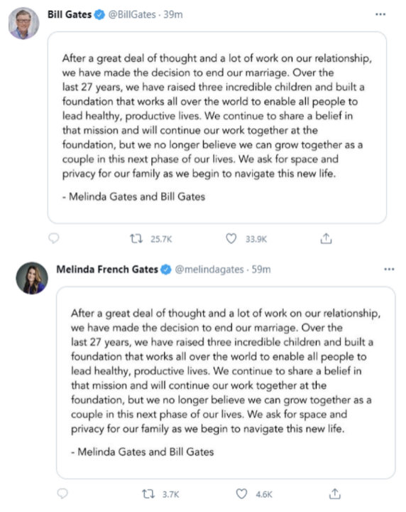 落款則是比爾·蓋茨和梅琳達(dá)·蓋茨,兩人的聲明都設(shè)置為禁止評(píng)論。面對(duì)這樣的離婚原因,網(wǎng)友們認(rèn)為“很勵(lì)志”“簡(jiǎn)單又體面”、“格調(diào)最高的離婚原因”。
