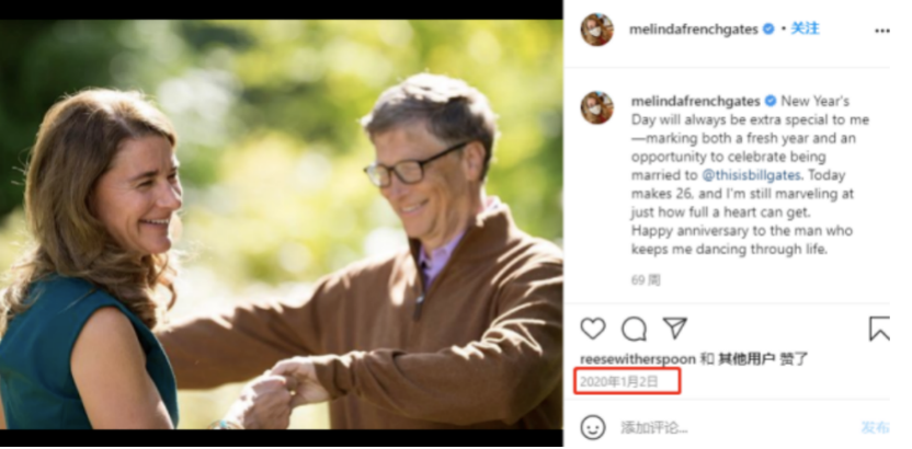 2020年1月2日(當(dāng)?shù)貢r(shí)間1月1日),是兩人結(jié)婚26年紀(jì)念日,梅琳達(dá)曬出兩人一起跳舞的照片,祝福這個(gè)會(huì)讓她一輩子這樣跳舞的人紀(jì)念日快樂(lè)。