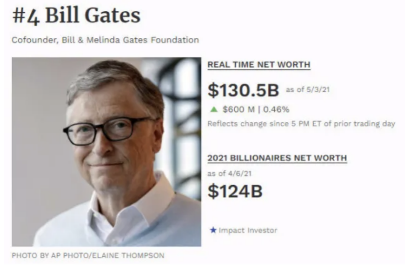 根據(jù)福布斯實(shí)時(shí)富豪榜數(shù)據(jù)顯示,截至當(dāng)?shù)貢r(shí)間5月3日,比爾·蓋茨身價(jià)達(dá)1305億美元,排名全球第四。此前,這對(duì)夫婦和“股神”沃倫·巴菲特共同創(chuàng)立了“捐贈(zèng)誓言”組織,承諾將會(huì)捐贈(zèng)一半以上的財(cái)富。