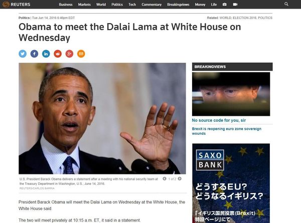 路透社6月14日報道稱,白宮表示,美國總統(tǒng)奧巴馬將于15日在白宮會見達賴?yán)铩?/p>
