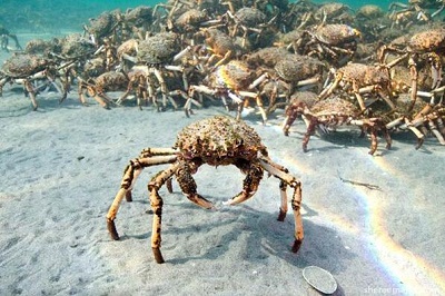 數(shù)量龐大的蜘蛛蟹一只挨著一只,有的甚至還疊在一起,望不到頭。它們浩浩蕩蕩的向前遷徙,壯觀無比。希爾表示,蟹群要進(jìn)入淺水區(qū)蛻皮,而這一時(shí)期它們很容易受到海豹、鳥類和海豚之類的捕食者的攻擊,所以它們就會(huì)成群結(jié)隊(duì)的一起行動(dòng)來保護(hù)自己。