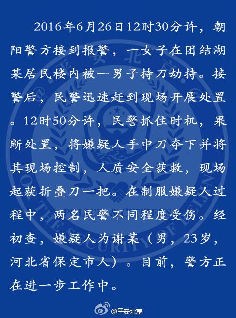 今天中午12點半,3名女子在團(tuán)結(jié)湖某居民樓內(nèi)聚餐,送餐男子將其中一名女子持刀劫持。報警后,民警趕到,在另兩名被困屋內(nèi)女孩的協(xié)助下將嫌疑人控制。處置中,一名民警手臂被刀劃傷,一名民警腿部受傷。經(jīng)查,嫌疑人謝某(23歲,河北省保定市人)。