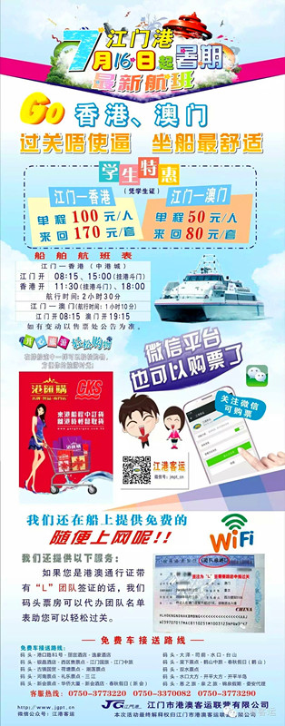 從7月16日起,江門(mén)港增加往來(lái)香港、澳門(mén)航班,并推出學(xué)生(含大學(xué)生)套票大優(yōu)惠。憑學(xué)生證江門(mén)至香港單程100元(人民幣,下同)/人,來(lái)回170元/人,航行時(shí)間約兩個(gè)半小時(shí),江門(mén)開(kāi)船時(shí)間為8時(shí)15分和15時(shí);江門(mén)至澳門(mén)單程50元/人,來(lái)回80元/人,航行時(shí)間約1小時(shí)10分,江門(mén)開(kāi)8時(shí)15分。
