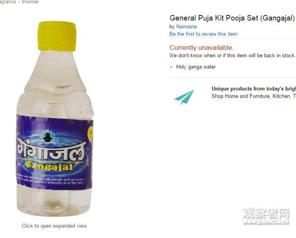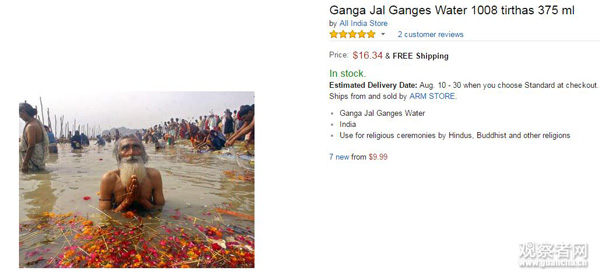 在亞馬遜和Snapdeal等電商網(wǎng)站上,恒河水標價……印度媒體說挺便宜,看著這黃黃的一瓶……我不想評價。