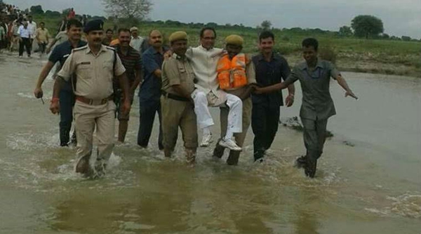 據英國《獨立報》8月23日報道,印度中央邦發(fā)生洪災,當地首席部長希夫拉杰?辛格?喬漢視察災情時被拍照,一張照片顯示兩名警察抬著他過河,另一照片中他卷起褲腳走在水中,卻把鞋子交給助手拿,而當時積水僅僅到腳踝處。