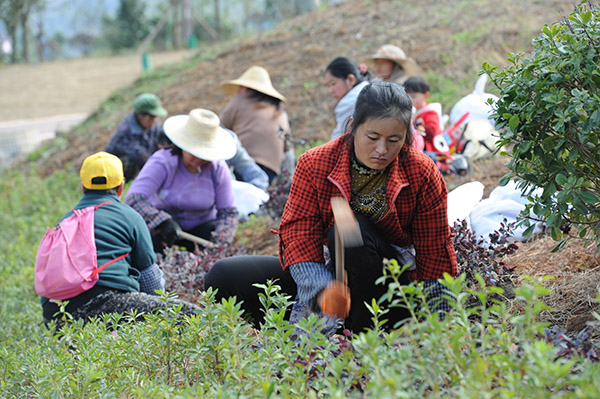 11月28日,在貴陽市烏當區(qū)的羊昌鎮(zhèn)羊昌村,鄧錫芬(前)和幾位村民在園區(qū)打理花園。