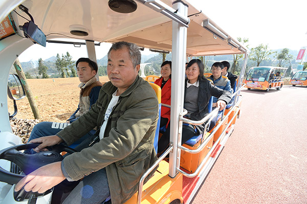 11月28日,退伍軍人、村民汪顯平開著電瓶車帶著游客觀光。汪顯平今年8月通過抓鬮的方式,投入12萬元,獲得了兩輛電瓶觀光車的經(jīng)營權。據(jù)悉,園區(qū)目前有20輛類似的電瓶觀光車。