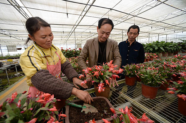 11月28日,在貴陽市烏當區(qū)的羊昌鎮(zhèn)羊昌村,村民黃朝琴(左一)向一家花卉種植企業(yè)的技術員學習蟹爪蘭的種植技術。