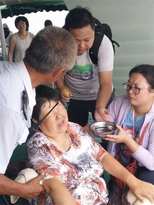 行駛到一半路程的時候,船長突然接到船員匯報:一位老太太癱坐在地上起不來了!上前詢問才知道,老太太早上起來時就出現(xiàn)腹瀉跡象,現(xiàn)在有些嚴(yán)重脫水。 船長一邊打電話給渤海映華海上游應(yīng)急辦公室匯報情況,一邊通過廣播尋找醫(yī)護人員,同時拿出船上的簡易折疊床、夏涼被和急救箱提供給患者,并在第一時間將病患移送到空氣通暢的地方休息,安排乘務(wù)員燒熱水給病患暖腸胃。