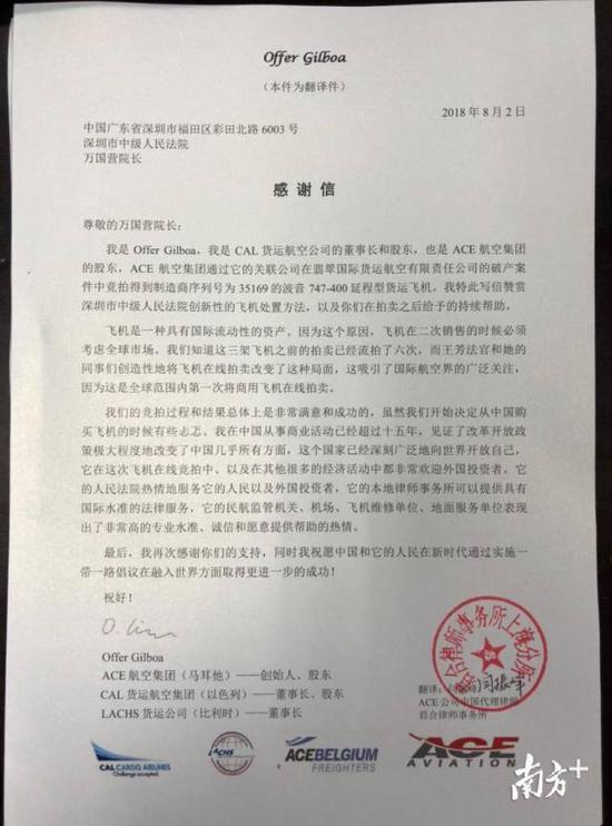 深圳中院創(chuàng)新的網(wǎng)拍模式,獲得了飛機(jī)競(jìng)買(mǎi)人ACE航空集團(tuán)創(chuàng)始人、股東Offer Gilboa先生的肯定和感謝。對(duì)此,Offer Gilboa先生專(zhuān)門(mén)發(fā)來(lái)感謝信,并錄制了一段感謝視頻。