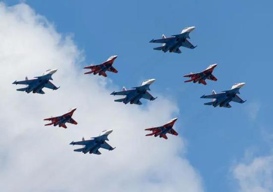 “庫賓卡鉆石”,由“俄羅斯勇士”和“雨燕”飛行表演隊(duì)駕駛“蘇-30SM”和“米格-29”組成。