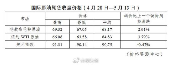 據(jù)國家發(fā)改委價格監(jiān)測中心監(jiān)測,本輪成品油調(diào)價周期內(nèi)(4月28日—5月13日)國際油價持續(xù)上漲。平均來看,倫敦布倫特、紐約WTI油價比上輪調(diào)價周期上漲3.35%。