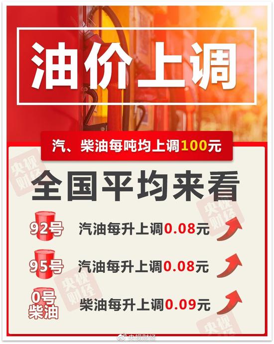 央視財經(jīng)記者從國家發(fā)改委獲悉,本次油價調(diào)整具體情況如下:汽油每噸上調(diào)100元,柴油每噸上調(diào)100元。