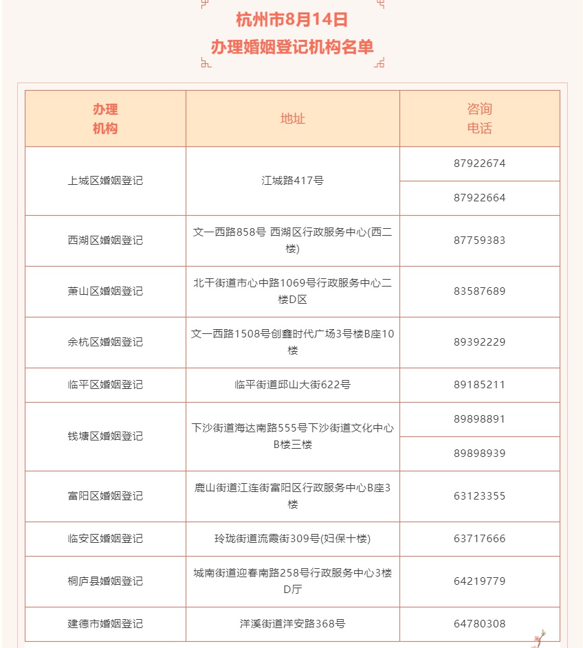 杭州市民政局指出,為減少人員聚集、滯留,已預(yù)約的新人,當(dāng)事人需按預(yù)約的時(shí)段到婚姻登記處登記,辦理登記結(jié)束后請(qǐng)及時(shí)離開(kāi)登記處。