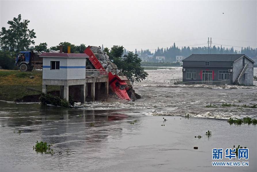 7月10日上午,湖南省華容縣新華垸發(fā)生重大管涌險(xiǎn)情,紅旗閘附近出現(xiàn)潰口。危難之際,十幾輛滿載麻石的卡車在大堤兩邊一字排開,以連車帶石的方式駛?cè)霛⒖诙伦L滾洪流。這群駕駛員被人們稱為“卡車敢死隊(duì)”。