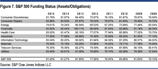 “標(biāo)普500指數(shù)十大板塊都存在資金不足的問(wèn)題,能源板塊的情況一直是最嚴(yán)重的。整體而言,標(biāo)普500強(qiáng)養(yǎng)老金的情況略有改善,但是必須指出的是,500強(qiáng)里,2015年12月時(shí)真正資金完全充足的只有30家,其中近一半都是來(lái)自金融板塊?!??