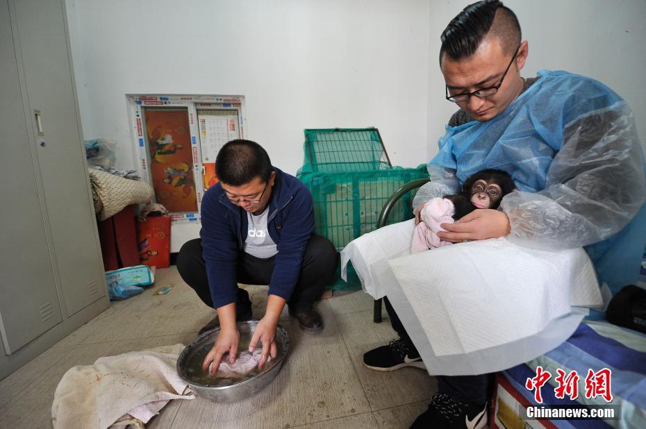 11月1日,山西太原動物園,飼養(yǎng)員“奶爸”照顧半歲大的“棄嬰”小猩猩。2016年5月2日,該園雌性黑猩猩“老七”順利產(chǎn)下寶寶。因為這批非洲黑猩猩系首次繁育,缺乏經(jīng)驗,“老七”把孩子晾在一邊,不聞不問,小猩猩成為一名“棄嬰”。于是,飼養(yǎng)員吳晉源、劉嶂鑫、趙璟、朱向博將小猩猩抱回育嬰室,當起了全職奶爸,給它梳洗喂奶,教它翻身站立,期待小猩猩長大后能夠順利回歸種群。圖為一位“奶爸”洗毛巾,一位“奶爸”安撫小猩猩。 韋亮 攝